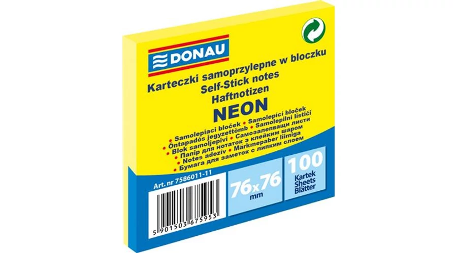 Öntapadó jegyzettömb, 76x76 mm, 100 lap, DONAU, neon sárga